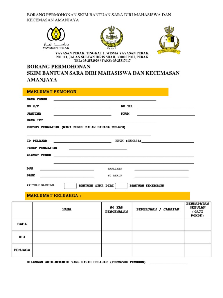 Borang Permohonan Bantuan Sara Diri dan Kecemasan Mahasiswa Negeri Perak juga boleh didapati secara percuma di Pejabat Yayasan Perak Pejabat Pusat Khidmat Masyarakat. Mohon Bantuan Sara Diri. Borang Permohonan Bantuan Sara Diri Kerajaan Negeri Selangor This is likewise one of the factors by obtaining the soft documents of this Borang Permohonan Bantuan Sara.